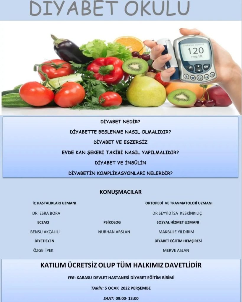 Covid-19 pandemi sürecinde online olarak “Diyabet Okulu Eğitimi”, 5 Ocak Perşembe gününden itibaren, Karasu Devlet Hastanesi’nde yeniden yüz yüze olarak başladı.