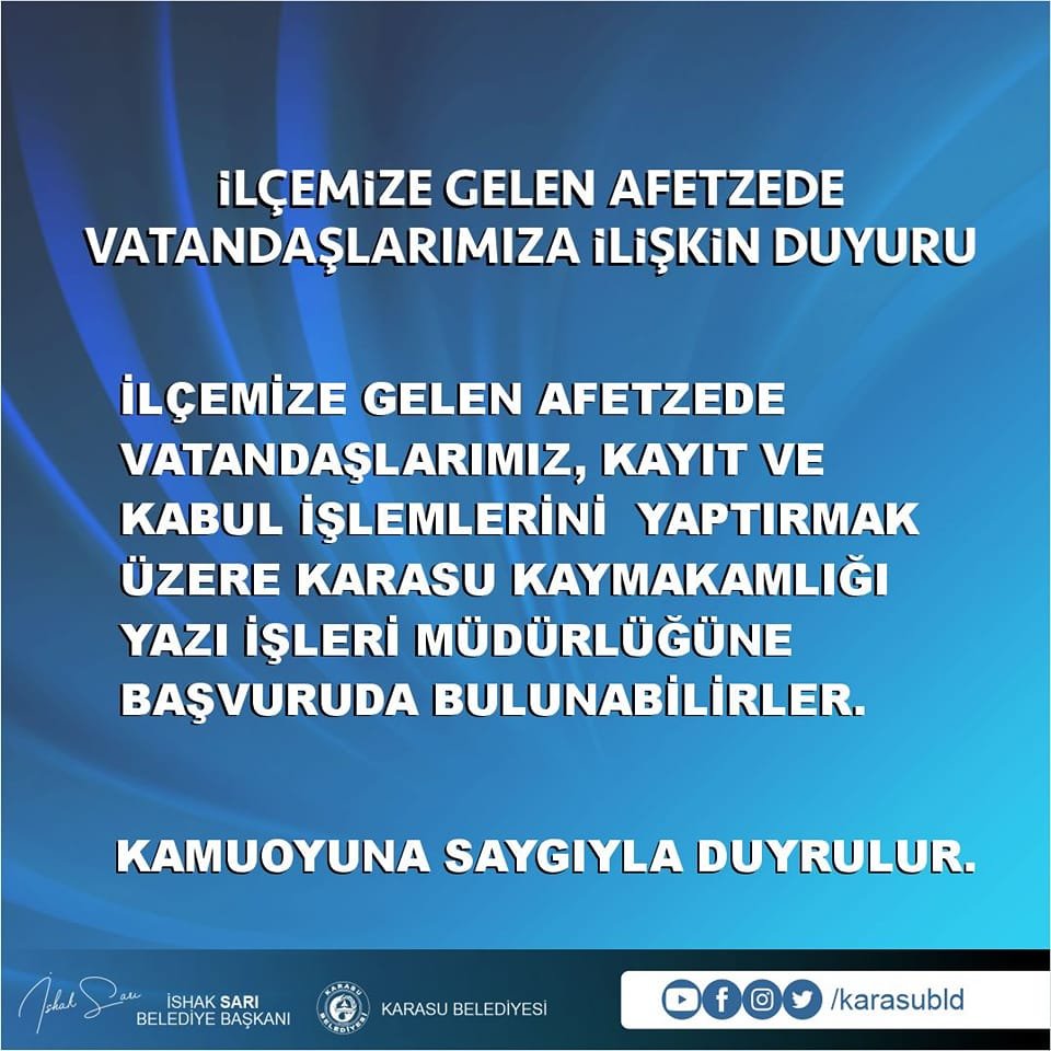 İlçemize gelen afetzede vatandaşlarımız, kayıt ve kabul işlemlerini yaptırmak üzere Karasu Kaymakamlığı Yazı İşleri Müdürlüğüne başvuruda bulunabilirler.