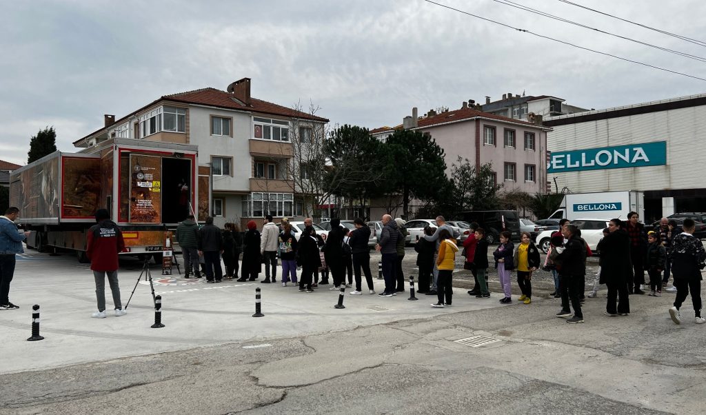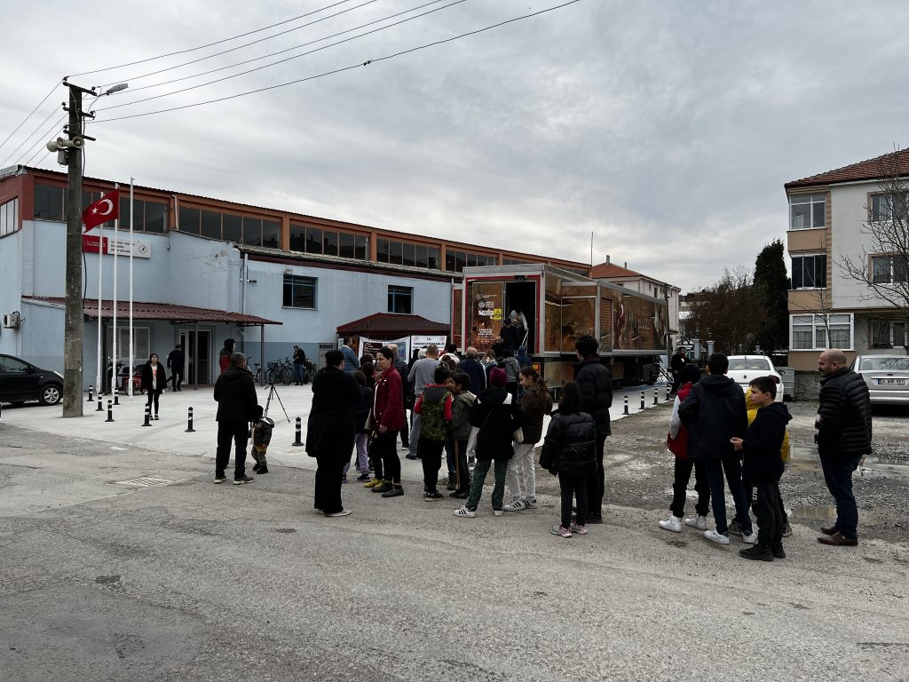 Karasu Spor Salonu önünde, saat: 09.00′da kapılarını ziyaretçilerine açan Mobil Müze’yi ilk gün yaklaşık 1500 kişi gezdi.