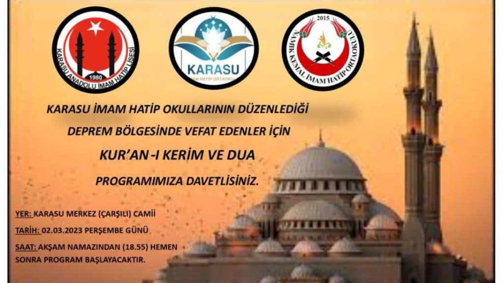 Karasu Anadolu İmam Hatip Lisesi, Karasu İmam Hatip Ortaokulu, Karasu Namık Kemal İmam Hatip Ortaokulu ve Karasu İlçe Müftülüğü işbirliğiyle, İlçe Milli Eğitim Müdürlüğü koordinesinde, depremde hayatını kaybeden vatandaşlar için Yasin-i Şerif ve Hatim Dua Programı icra edildi.
