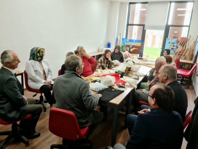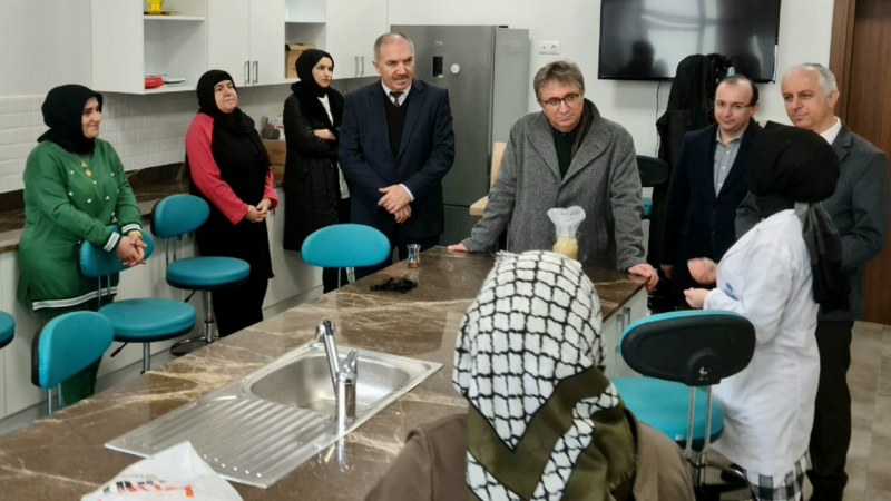 Kurslarda deprem bölgesi için dikilen battaniyeleri inceledi. Usta öğretici Hacer MUT‘dan bilgi aldı.