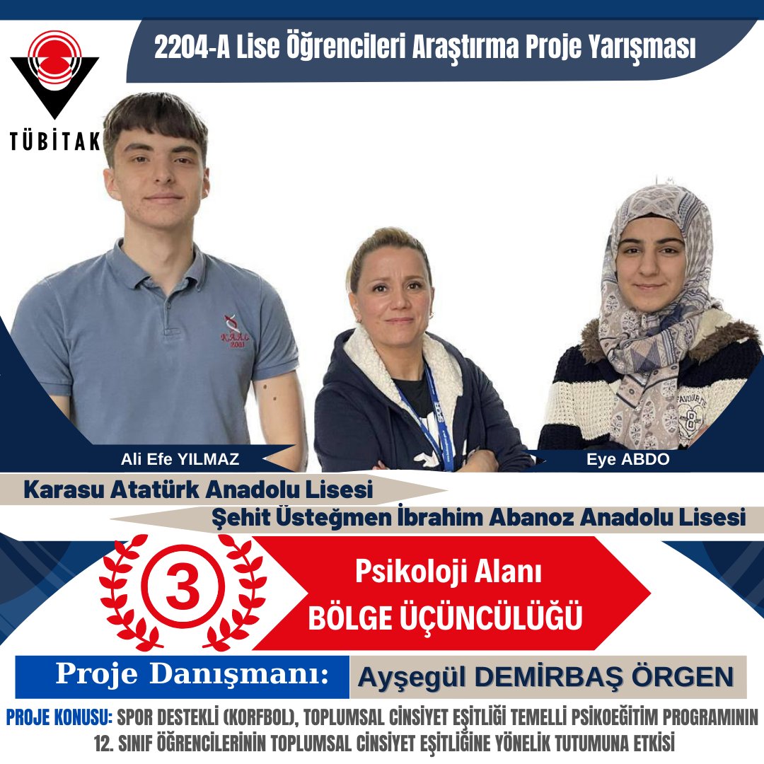 Karasu Atatürk Anadolu Lisesi Öğrencisi Ali Efe YILMAZ ve Şehit Üsteğmen İbrahim Abanoz Anadolu Lisesi Öğrencisi Eye ABDO, Danışman Öğretmenleri Ayşegül DEMİRBAŞ ÖRGEN rehberliğinde hazırladıkları “Spor Destekli (Korfbol), Toplumsal Cinsiyet Eşitliği Temelli Psikoeğitim Programının 12. Sınıf Öğrencilerinin Toplumsal Cinsiyet Eşitliğine Yönelik Tutumuna Etkisi” isimli psikoloji projesi ile bölge üçüncüsü oldular.
