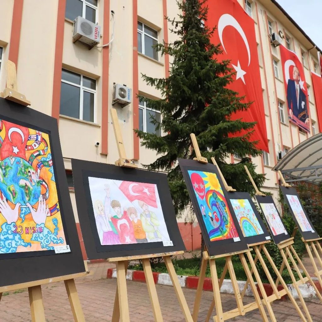 İlkokul ve ortaokul öğrencileri arasında, İlçe Milli Eğitim Müdürlüğü tarafından düzenlenen 23 Nisan Ulusal Egemenlik ve Çocuk Bayramı Resim Yarışması‘nda dereceye gören öğrencilerin resimleri, tören alanında sergilendi.