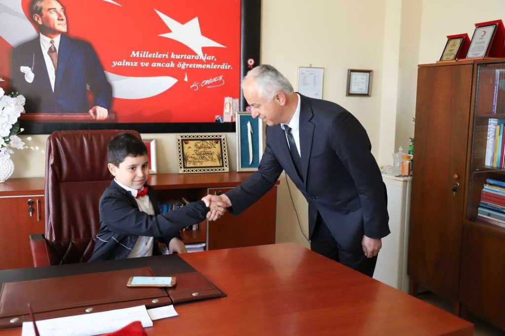 Kaymakam HELVACI’nın koltuğuna oturan Minik Kaymakam, “bir gün de olsa, Kaymakam olmaktan çok mutlu olduğunu” söyledi.
