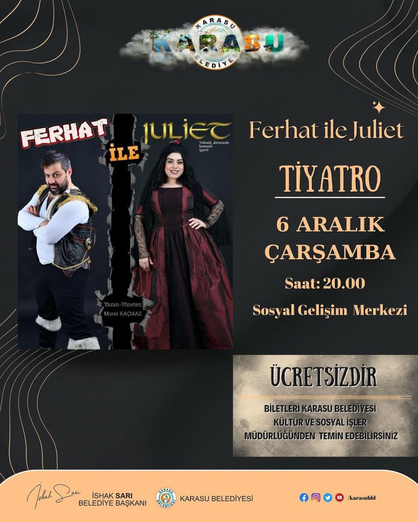 Sırf Tiyatro tarafından sahnelenen ve Murat KAÇMAZ’ın yazıp yönettiği, “Ferhat ile Juliet” adlı komedi, 6 Aralık akşamı Karasu Sosyal Gelişim Merkezi‘nde sahnelendi.