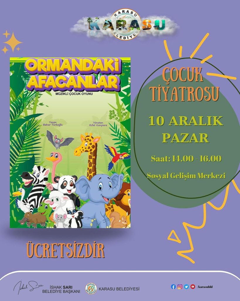 Müzikli Çocuk Oyunu olan Ormandaki Afacanlar, Karasu Sosyal Gelişim Merkezi’nde saat: 14.00 ve 16.00’da iki ayrı seans olarak sahnelendi.