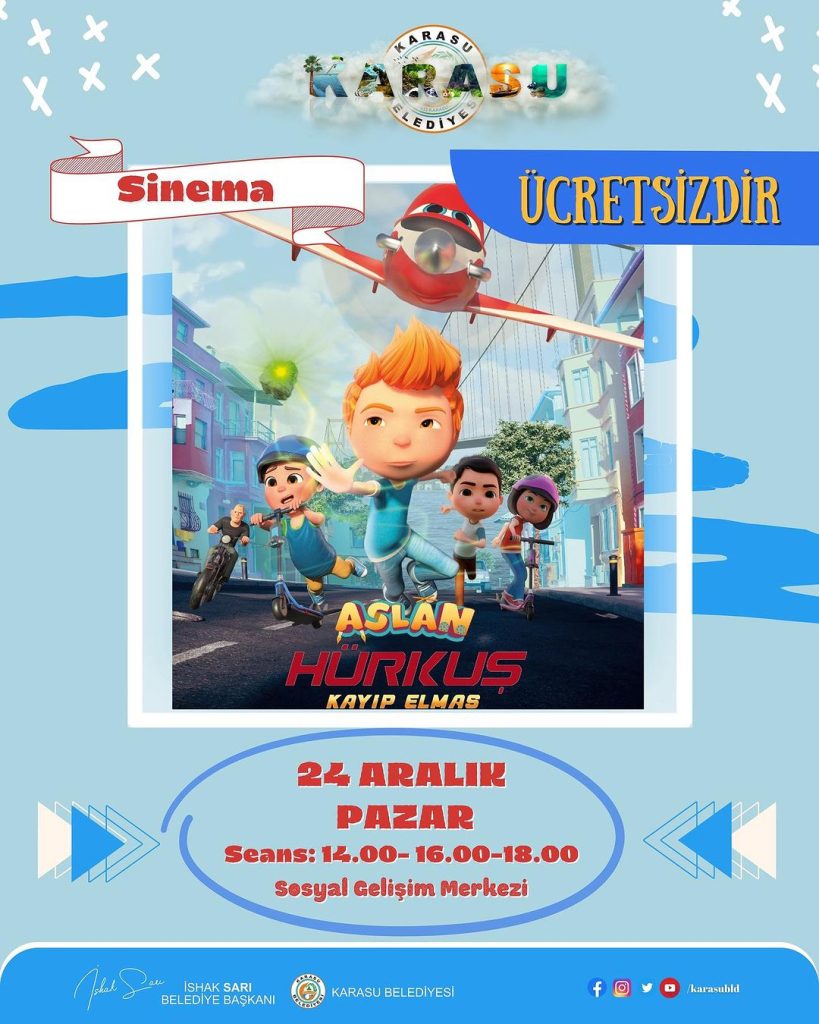 Karasu Belediyesi, Aralık Ayı etkinlikleri çerçevesinde çocuklara yönelik planlanan Aslan Hürkuş ‘Kayıp Elmas‘ çocuk sineması etkinliğini de çeşitli platformlardan vatandaşlara duyurdu.