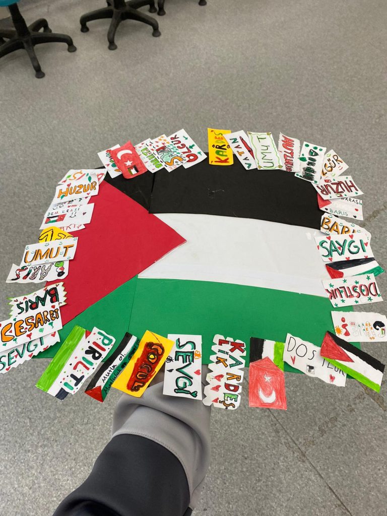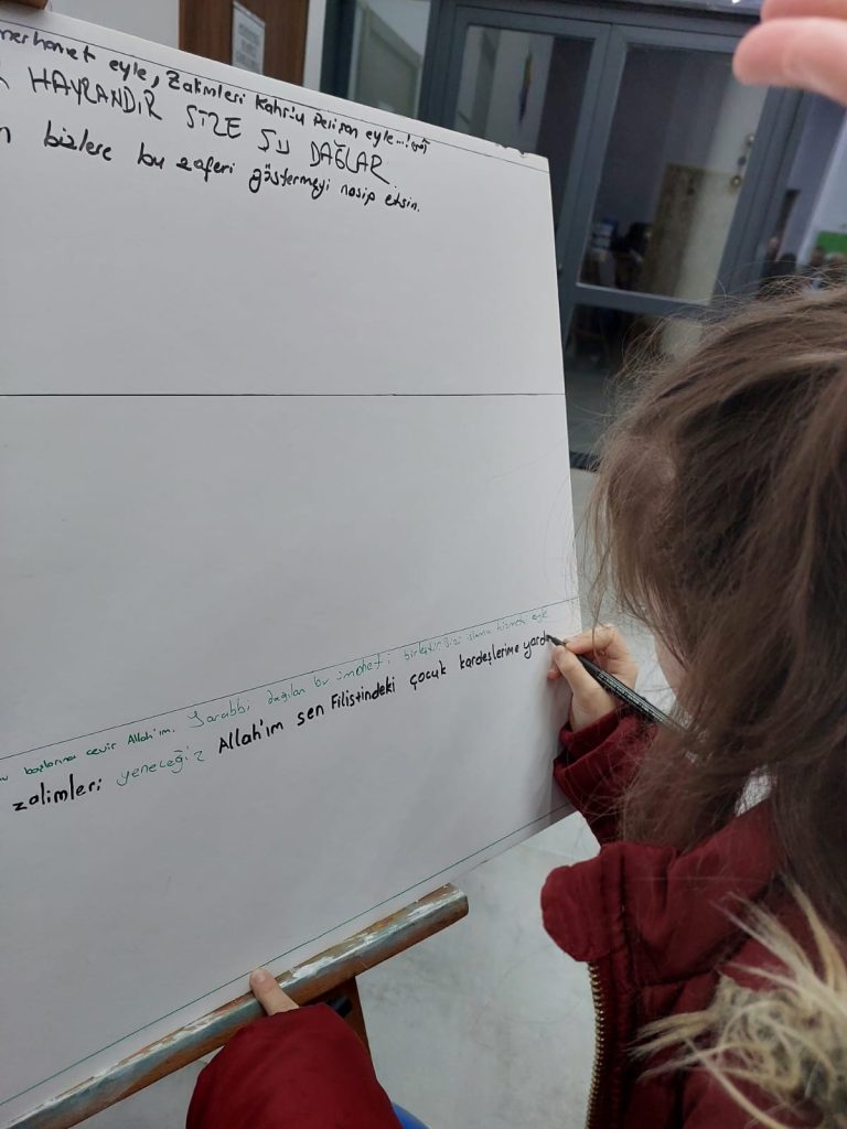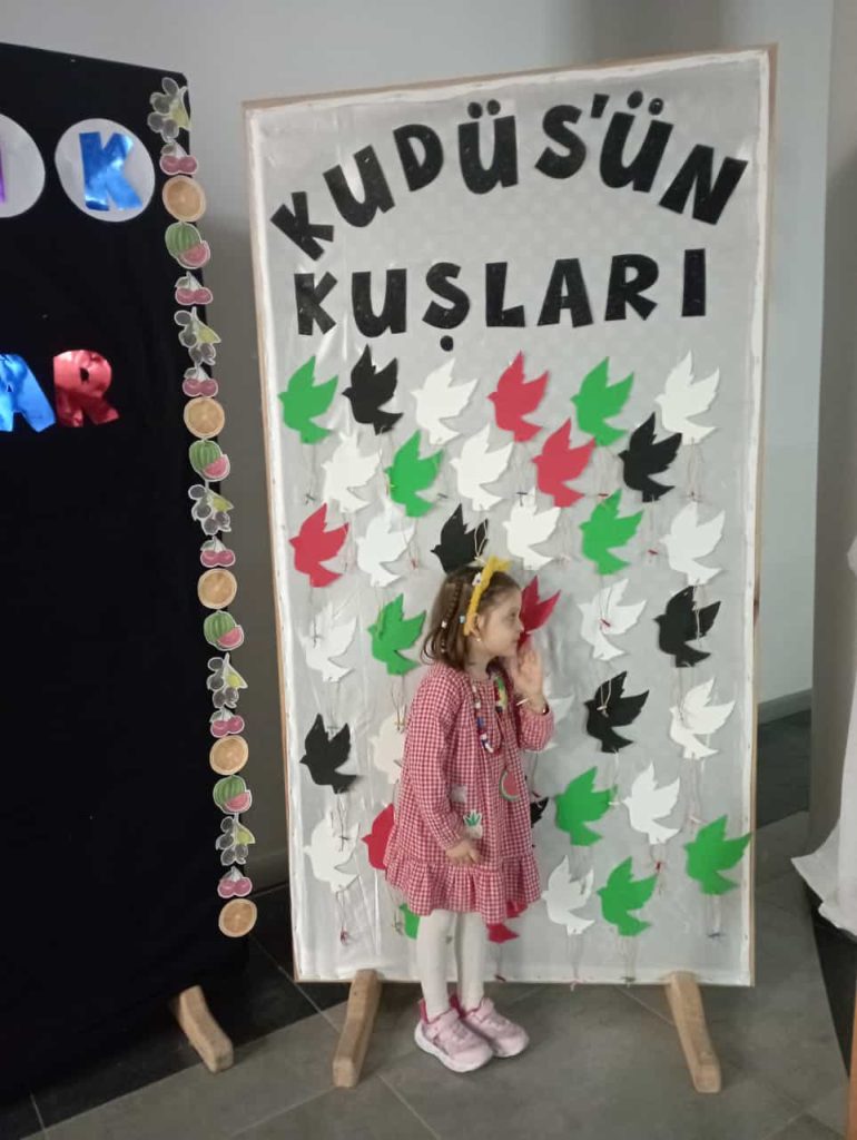 Tasarım sınıfı öğrencilerinin hazırlamış olduğu “Kudüs’ün Kuşları” temsili panoya çocuklar, dualarını ve notlarını astılar.