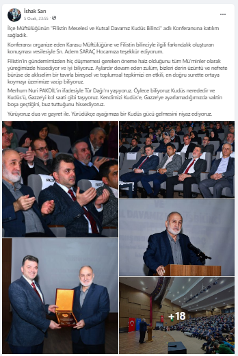 Belediye Başkanı İshak SARI, sosyal medya hesabında, konferansı organize eden Karasu Müftülüğü’ne ve Filistin bilinciyle ilgili farkındalık oluşturan konuşması vesilesiyle Adem SARAÇ’a teşekkür ederek: