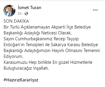 Sayın Cumhurbaşkanımız Recep Tayyip Erdoğan’ın Tensipleri ile Sakarya Karasu Belediye Başkanlığı Adaylığımızın Hayırlı Olmasını Temenni Ediyorum.
